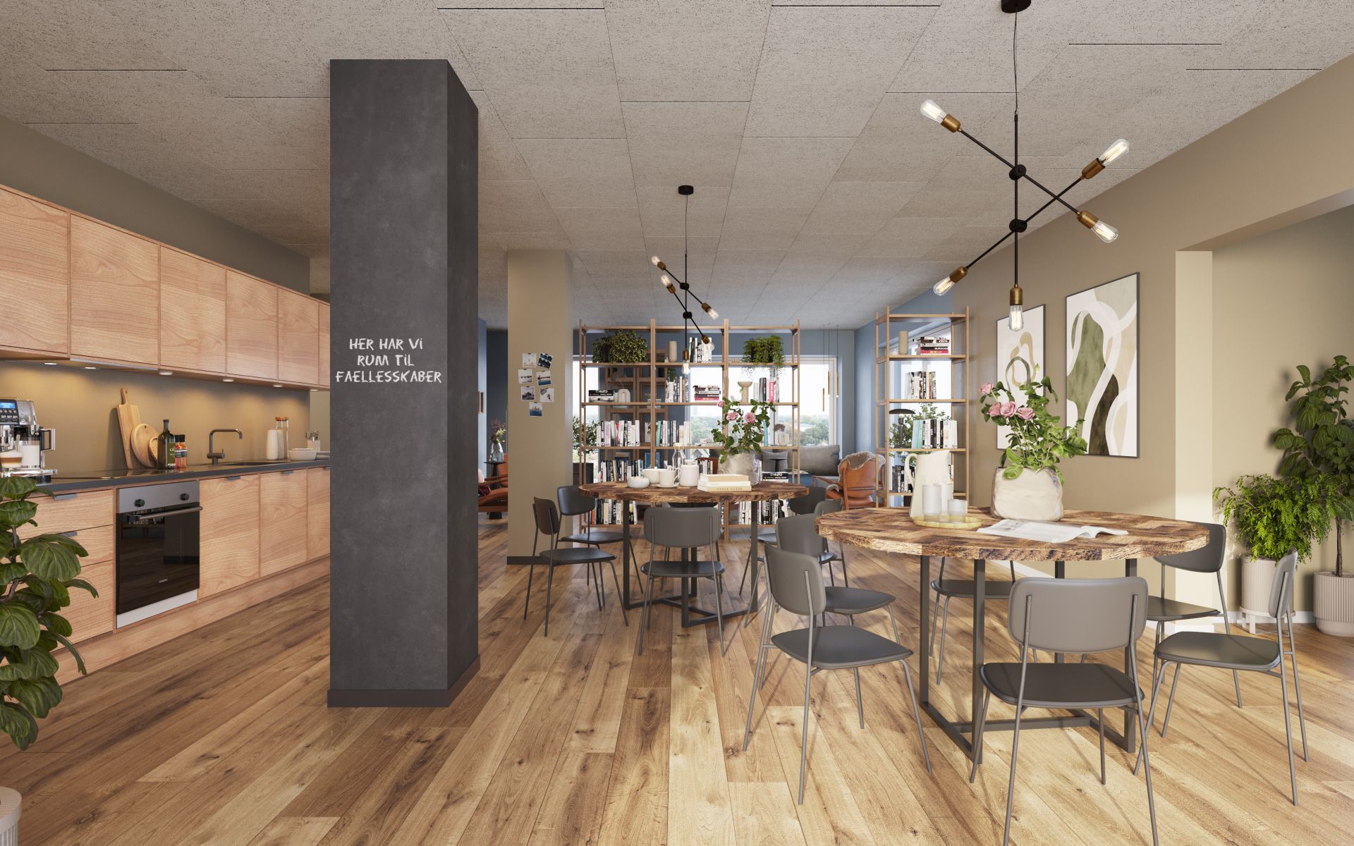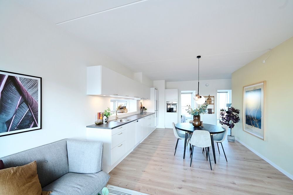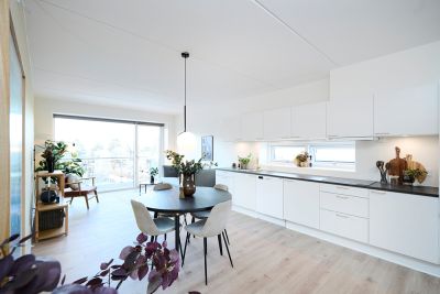 Lejlighederne indeholder alle kombineret køkken-alrum og stue med store vinduespartier fra gulv til loft, som giver et godt lysindfald. De lyse køkkener er fra HTH og indeholder induktionskogeplade, opvaskemaskine, emhætte, køle-/fryseskab og ovn med pyrolyse-renseprogram.
