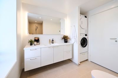 Badeværelserne er indrettet med moderne klinker, separat bruseniche med linjeafløb, vaskesøjle med vaskemaskine samt tørretumbler, spejl med indbygget lys og væghængt toilet med indbygget cisterne.