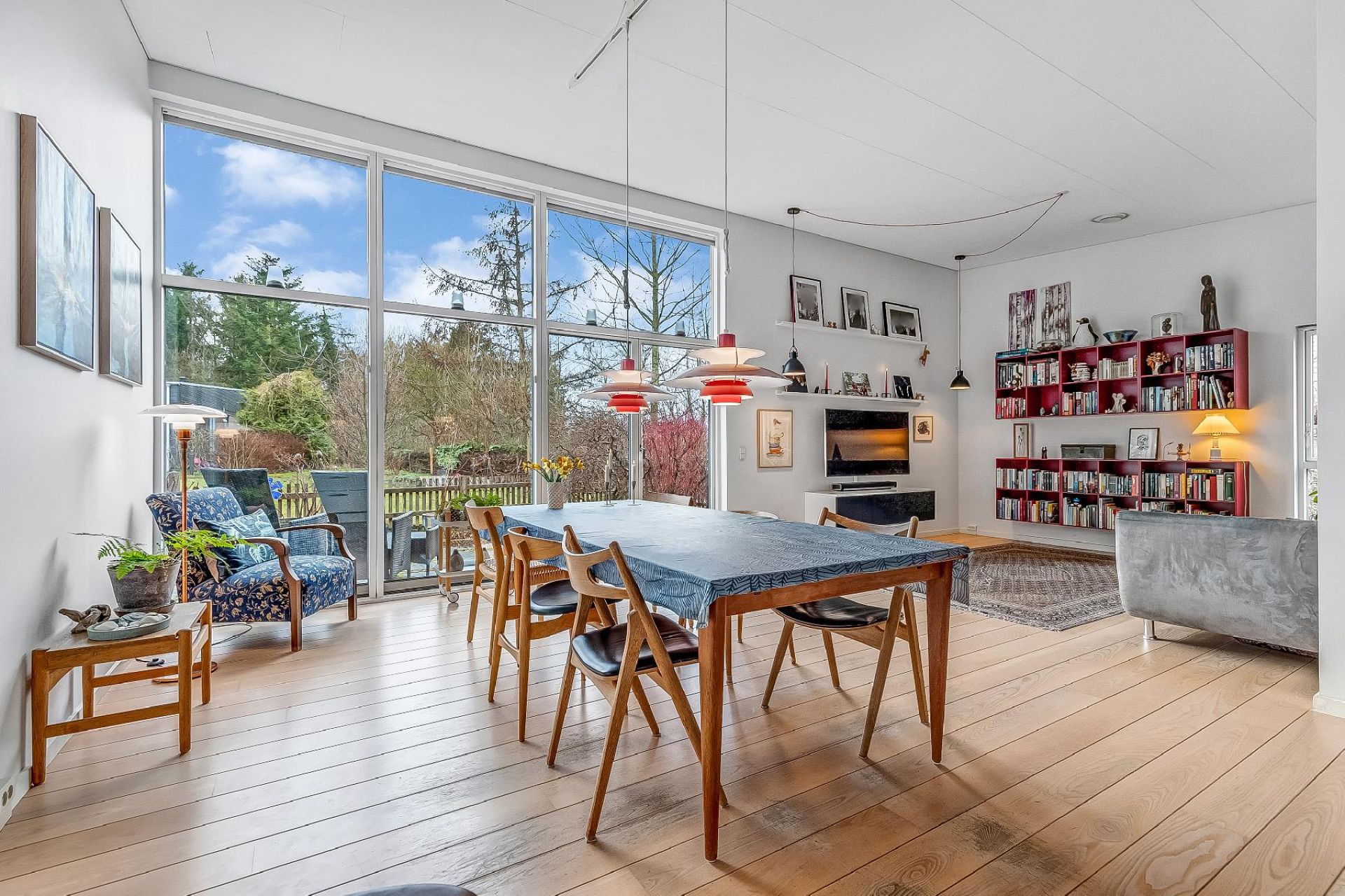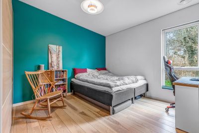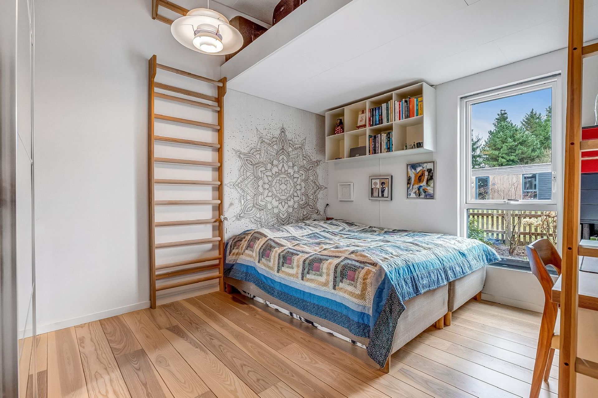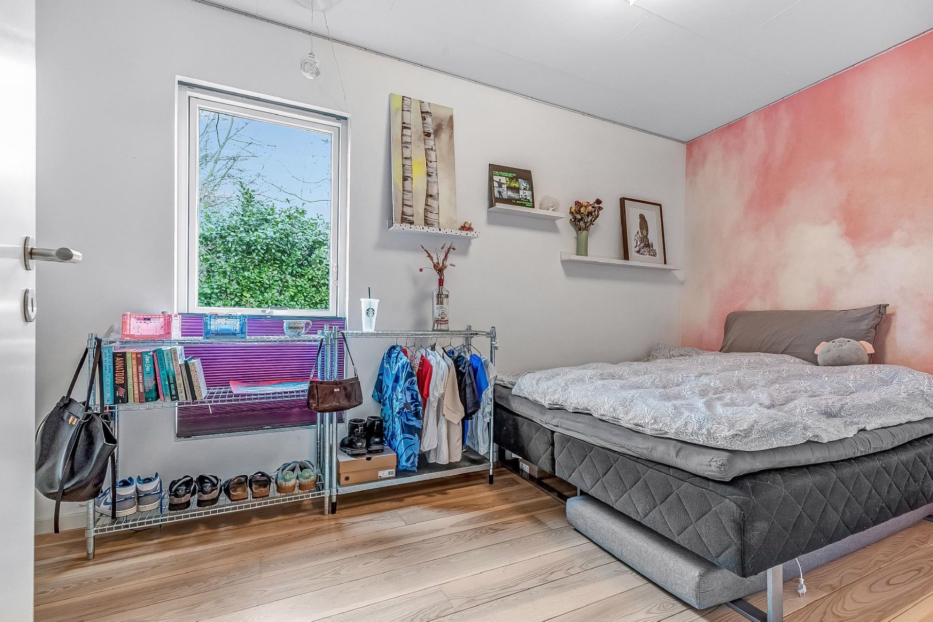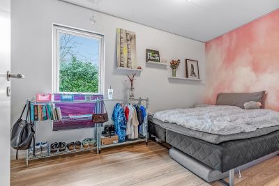 Ud over et stort, lyst køkken-/alrum med store, sydvendte vinduespartier er der tre store (>13 m2) og et lidt mindre (9,5 m2) værelse, to badeværelser (et med badekar, et med bruser) og et rummeligt bryggers, der også fungerer som indgang. Til huset hører en markise-overdækket terrasse og en lille forhave, der vender mod fællesarealerne, samt en ugeneret, privat baghave. Der ud over er der et fint, isoleret skur på 9 m2 og et cykelskur på 5 m2.