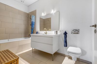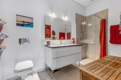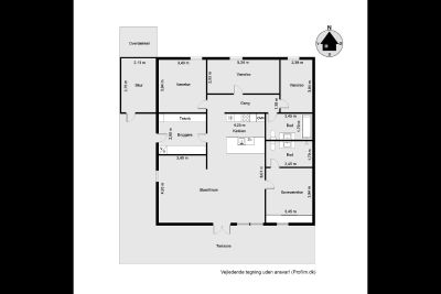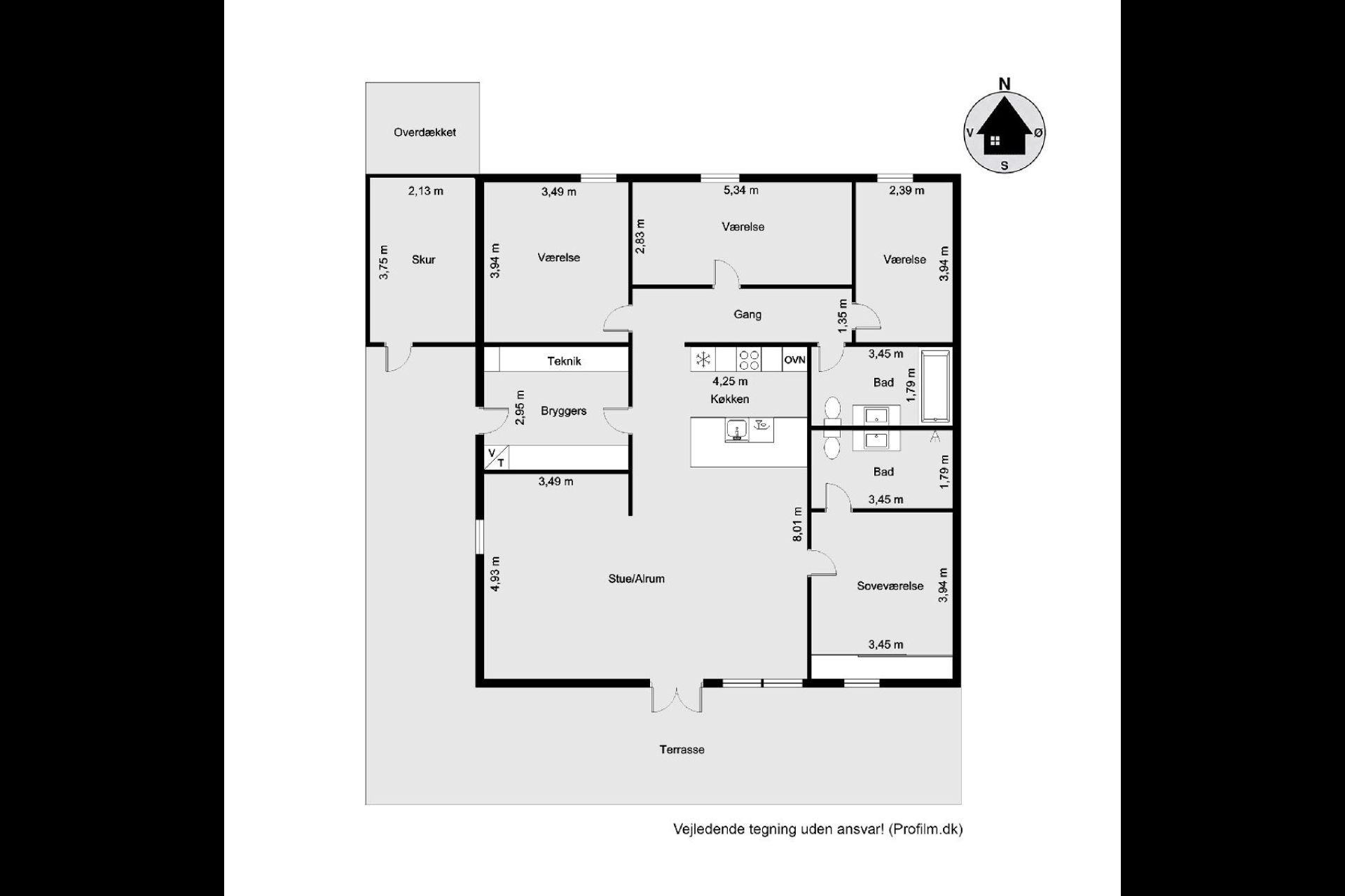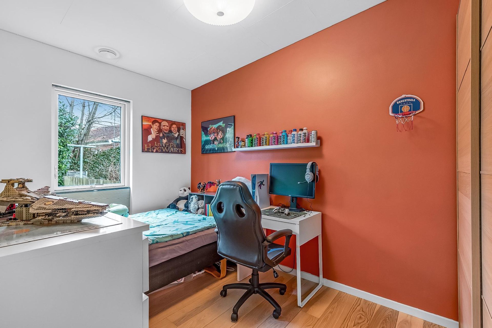 Ud over et stort, lyst køkken-/alrum med store, sydvendte vinduespartier er der tre store (>13 m2) og et lidt mindre (9,5 m2) værelse, to badeværelser (et med badekar, et med bruser) og et rummeligt bryggers, der også fungerer som indgang. Til huset hører en markise-overdækket terrasse og en lille forhave, der vender mod fællesarealerne, samt en ugeneret, privat baghave. Der ud over er der et fint, isoleret skur på 9 m2 og et cykelskur på 5 m2.