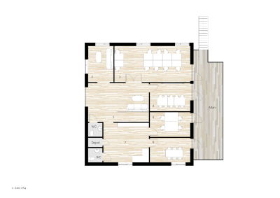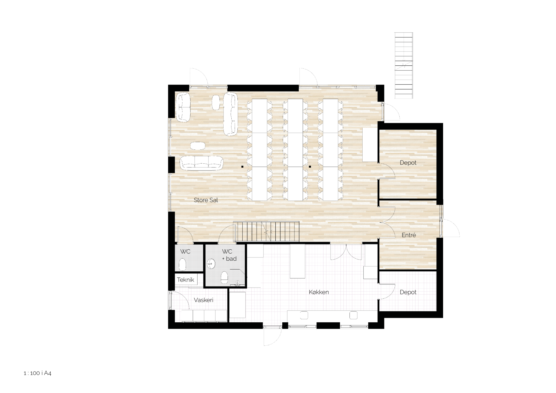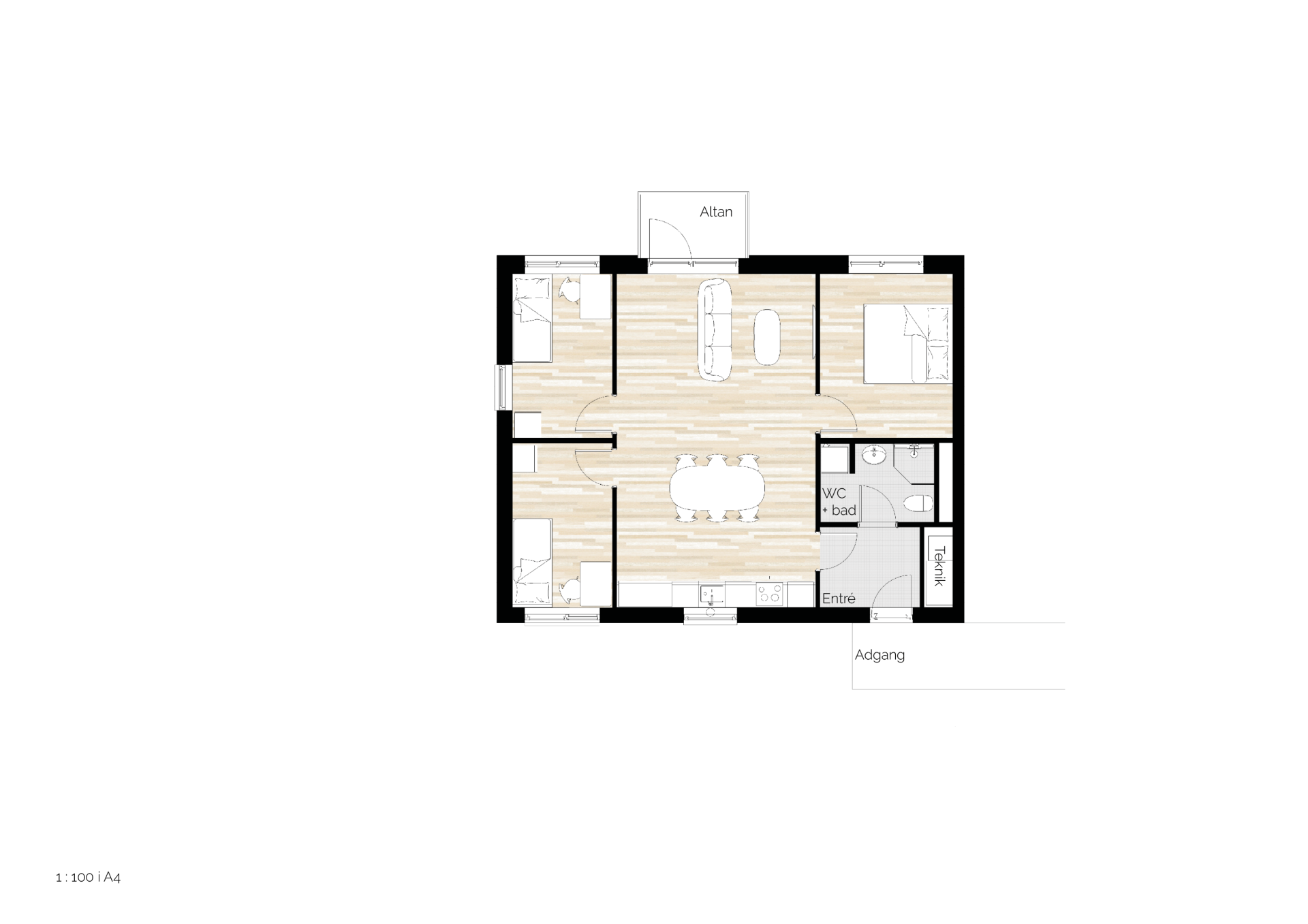 Denne bolig er en 4v lejlighed på 86 m2 og en andel af fælleshuset på 9 m2 – i alt 95 m2.