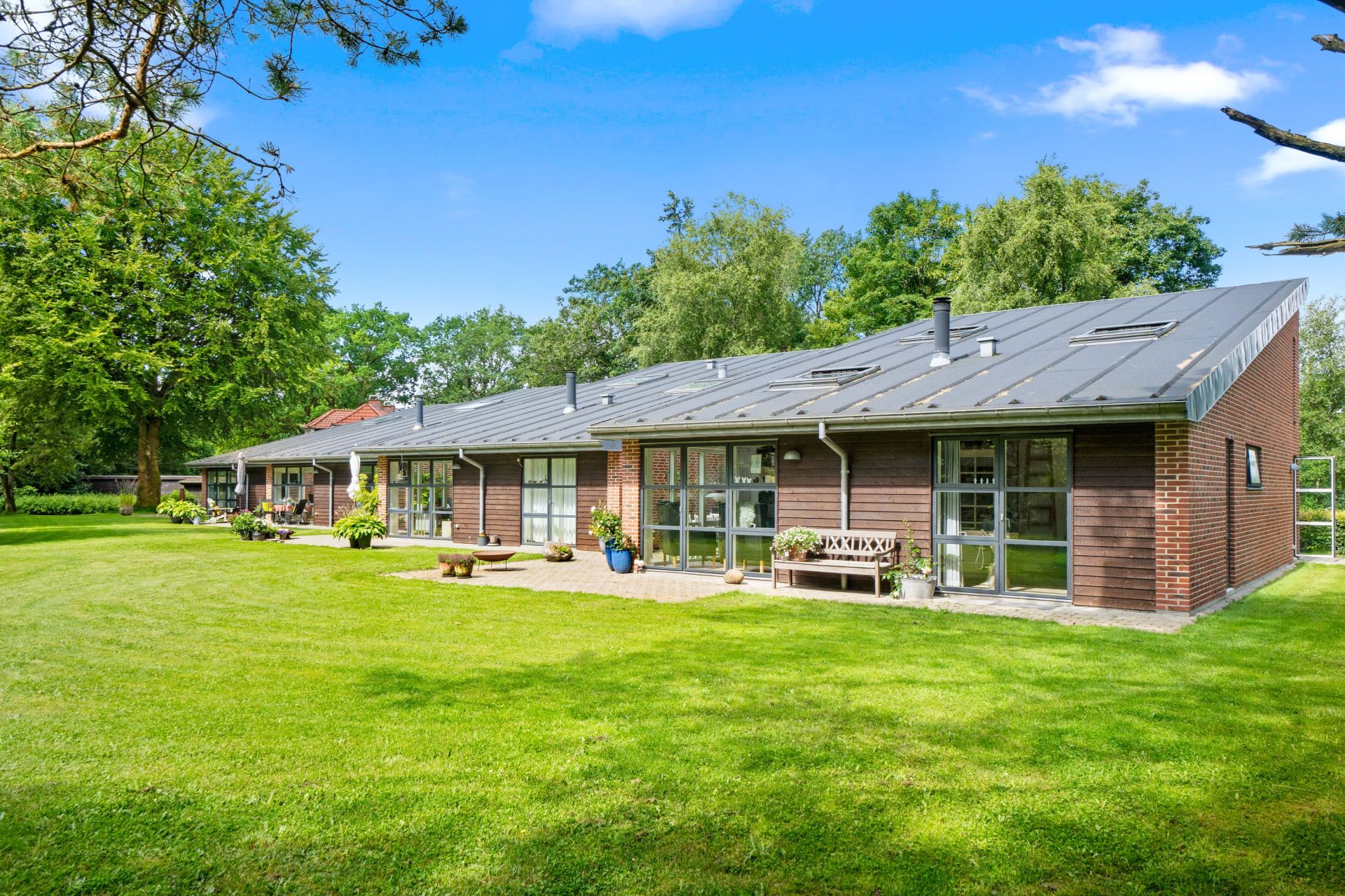Her er et flot og harmonisk sammenspil mellem naturen og bygningerne som ligger rundt på grunden. Sammenholdt med den gl. hovedbygning og overgangen til de 4 flotte boliger er udført arkitekttonisk perfekt. De 4 boliger fremtræder med hver deres personlige særpræg og indretning, hvilket giver hele ideen med fælleskabet endnu mere liv.