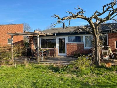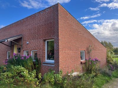 Den ledige lejlighed er på 74 m2 og rummer køkken med spiseplads, stue, badeværelse, samt to værelser. Dertil er der terrasse, samt et lille udeareal på begge sider af huset.