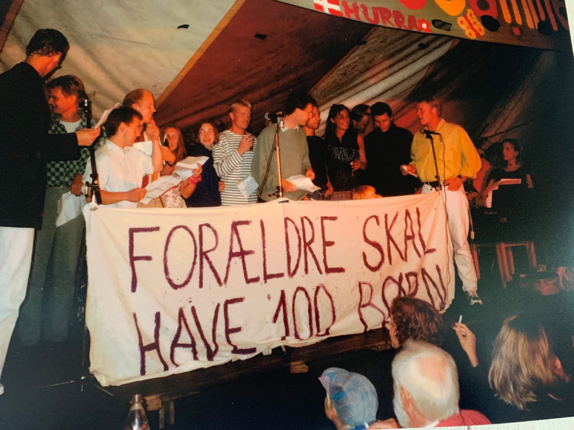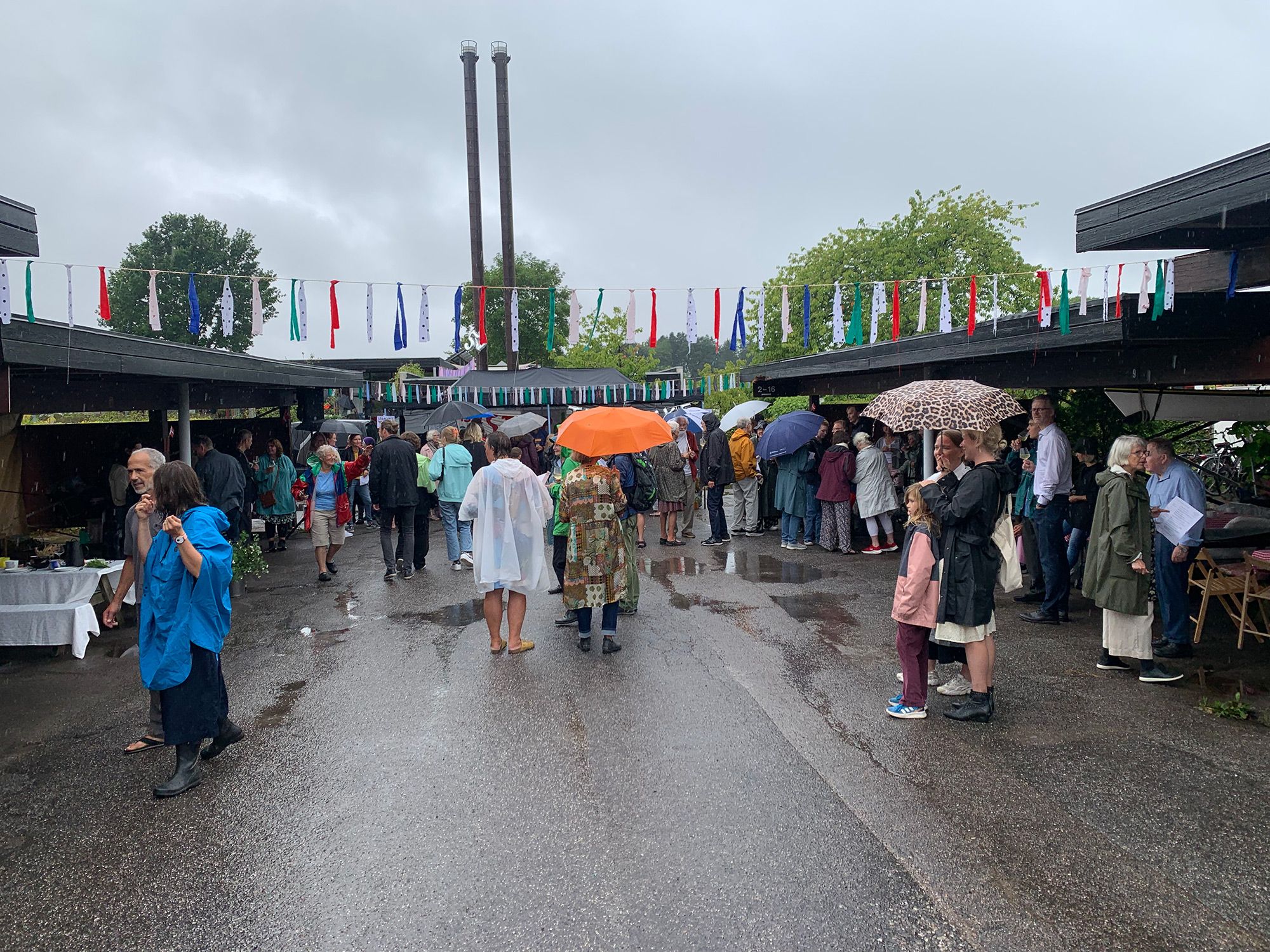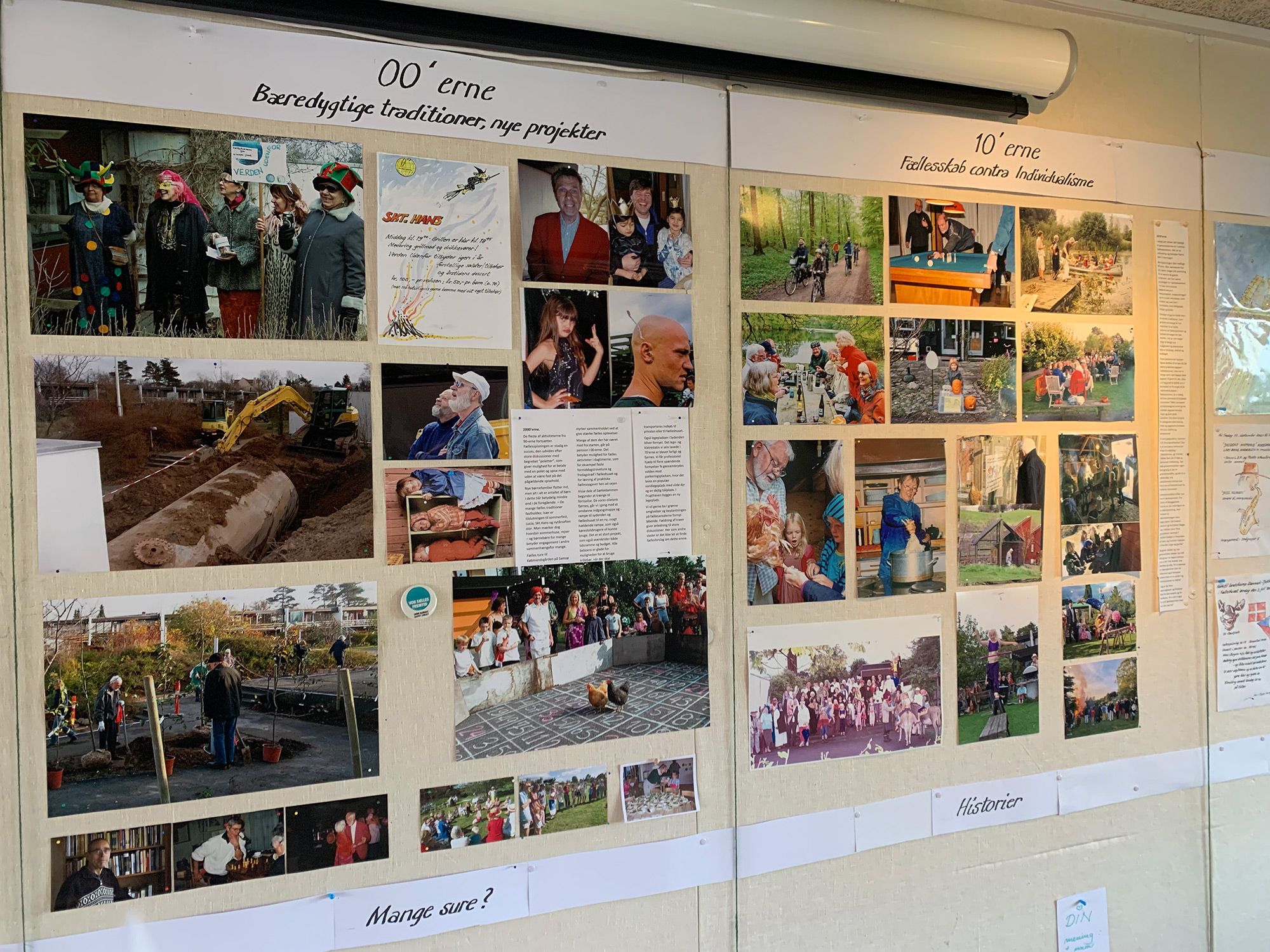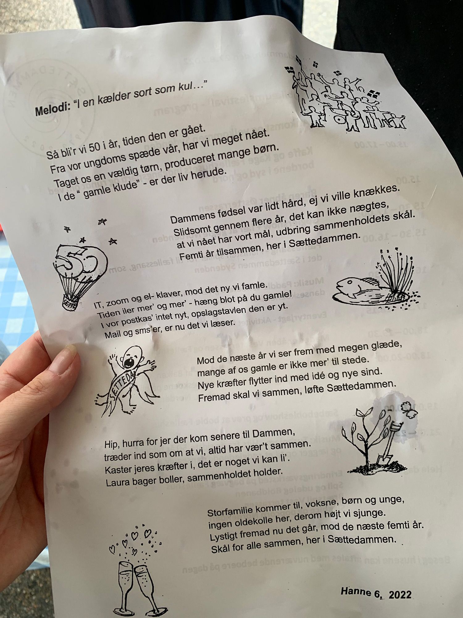 Bofællesskabets første 50 år sættes oplysende i perspektiv med et par taler. Mie, som har boet i Sættedammen i 20 år, fortæller, hvordan hun oplevede, at hendes børn fik 100 nye bedsteforældre ved familiens ankomst til bofællesskabet. Mies anekdoter kommer omkring beboere, der har gjort uudsletteligt indtryk, og rundt omkring blandt de mange tilhørere kan man se genkendende nik til alt det, Mie fortæller om: Hjerterum, virkelyst og et stærkt fællesskab. Og ikke mindst hvordan der var, og er, plads til børn og deres fantasifulde påfund. Den næste taler, Daniel, kan berette om, at det stærke fællesskab, og lysten til at gøre en forskel i hinandens liv, ikke blev sat på stand-by af coronaens indtog i landet. Tværtimod. Daniel mener, at corona styrkede fællesskabet. Her kunne nye ideer om fælles indkøb til dem, der var i isolation, morgensang fra terrasserne og online-fællesmøder pible frem. Sådan følger man med store, indgribende begivenheder – og tiden i al almindelighed.
