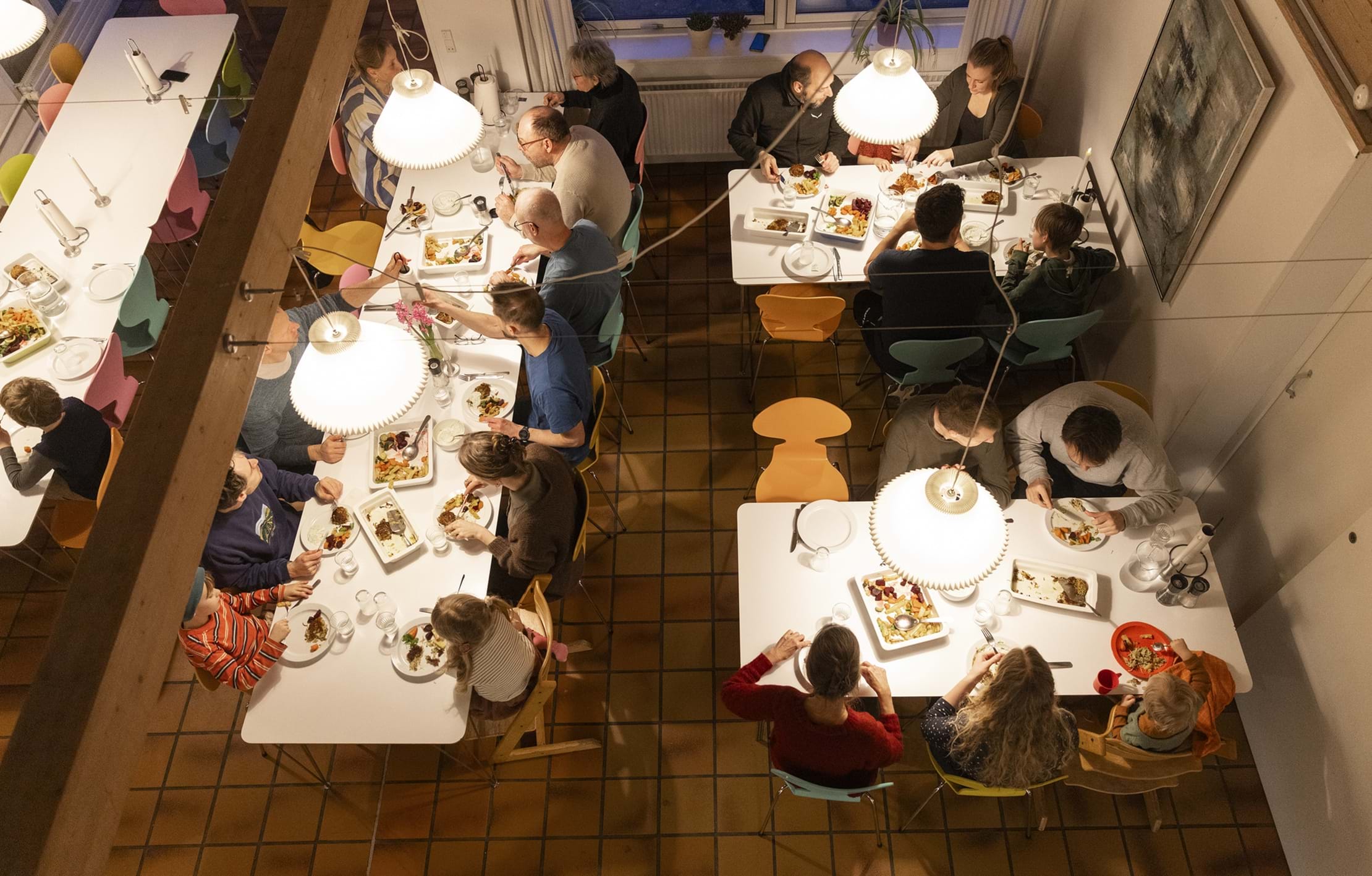 Fællesspisningen spiller en central rolle i bofællesskabet A/B Fælledens hverdag. Der laves madplaner flere uger frem, en indkøber handler ind, og fire beboere står for madlavningen på skift. Andelshaverne spiser sammen fem dage om ugen. For Patrick og familien betyder det konkret mindre pres i en travl hverdag.
