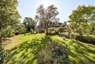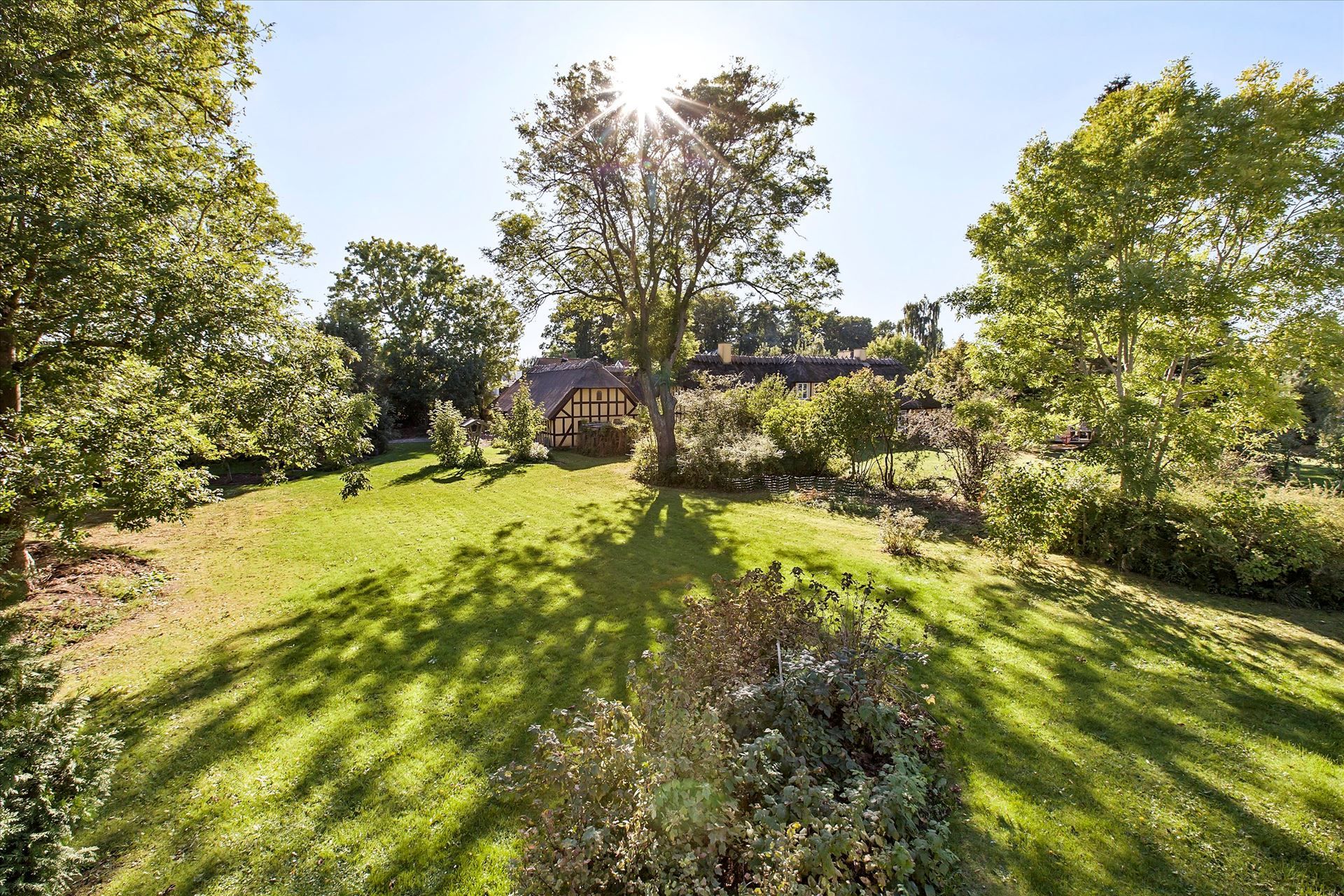 Grunden er i alt godt 5200m2 og er delvis udlagt som parklignende område med store træer og græsarealer (boldbane????). Ejendommen har to porte med tilkørsel fra to sider, familiehave med stråtægt pavillion ud for hovedhuset samt have ud for aftægtsboligen.
