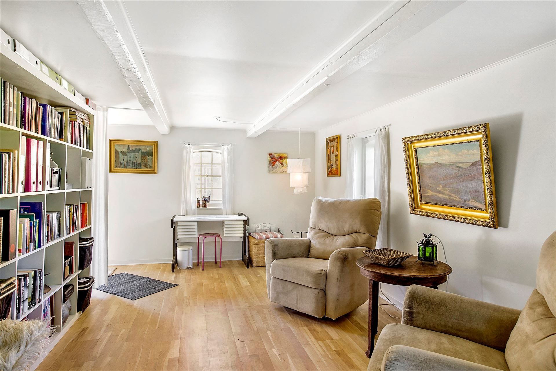 Den mindre stue har dobbelte terrassedøre ud til haven.
