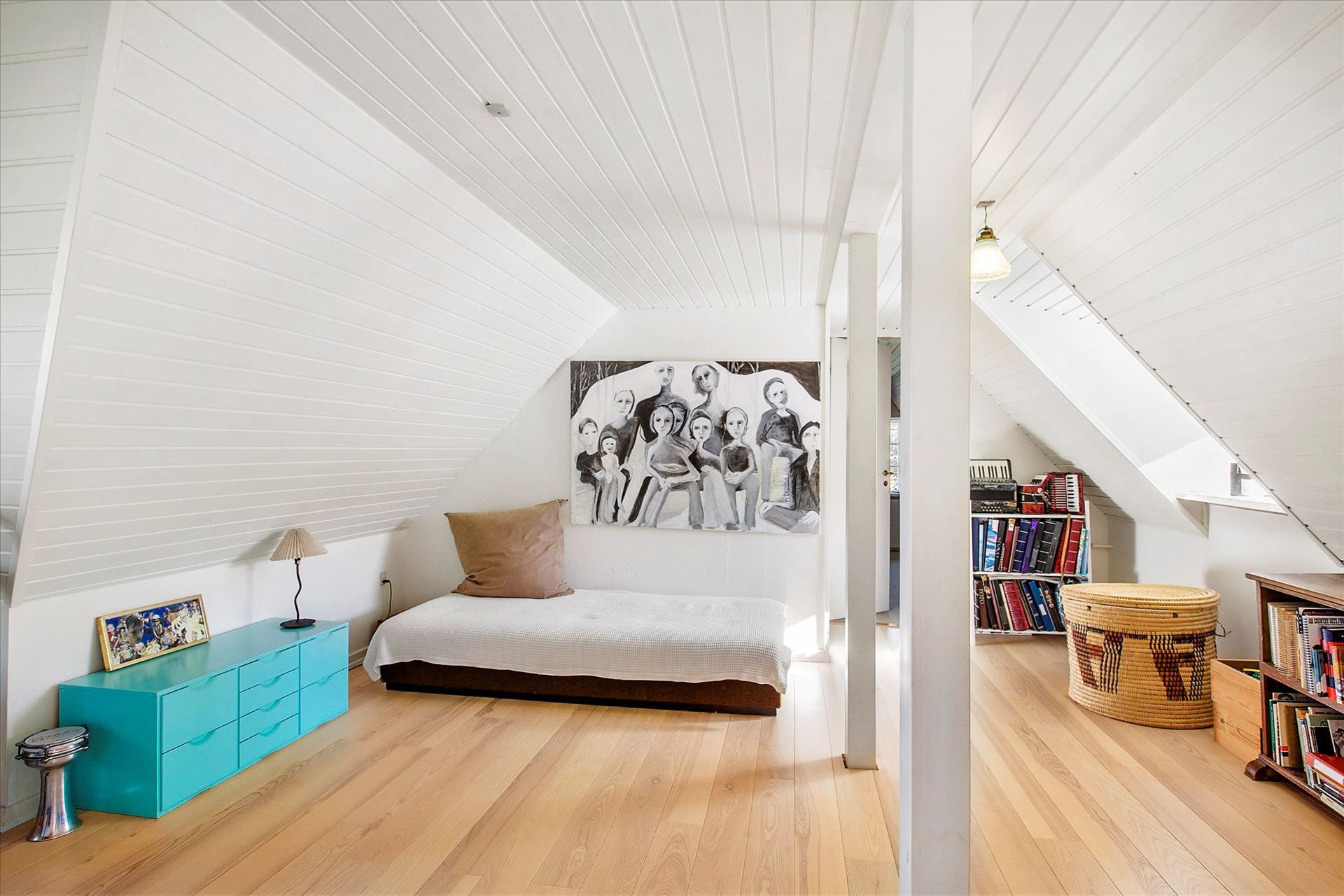 Første sal rummer stort repos / kontor / legerum / krearum, stort værelse, badeværelse med brus og kar, gangareal med mange indbyggede skabe og endnu et stort værelse med alkove. Dette værelse kan benyttes fra begge boliger, hvis man ønsker anden opdeling, da der fra bryggers er trappe til uudnyttet loftsrum over aftægtsboligen og dør videre indtil dette værelse.