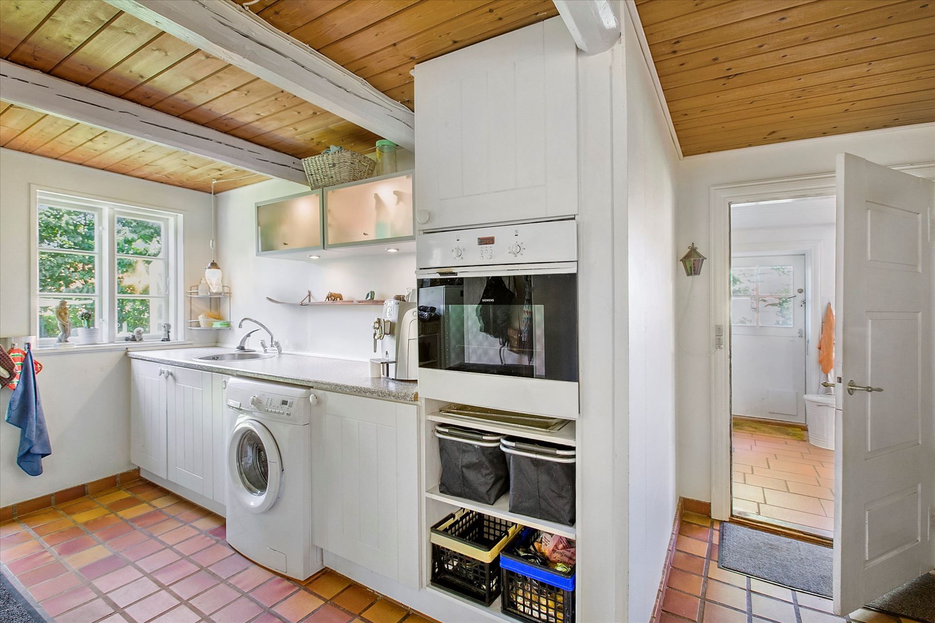 Aftægtsboligen” kan ligeledes betrædes enten via egen indgang eller fælles indgang til det store bryggers, som ligger imellem de to boliger og pt. benyttes af begge. Bryggerset med vaskemaskine, tøjtørrerum, vask, bordplads, ovn mv. kan benyttes fælles for de to boliger som nu eller lægges til aftægtsboligen, hvis man har brug for mere plads der. Der er skorsten i bryggerset hvortil, der kan tilsluttes en brændeovn, samt udgang til have.