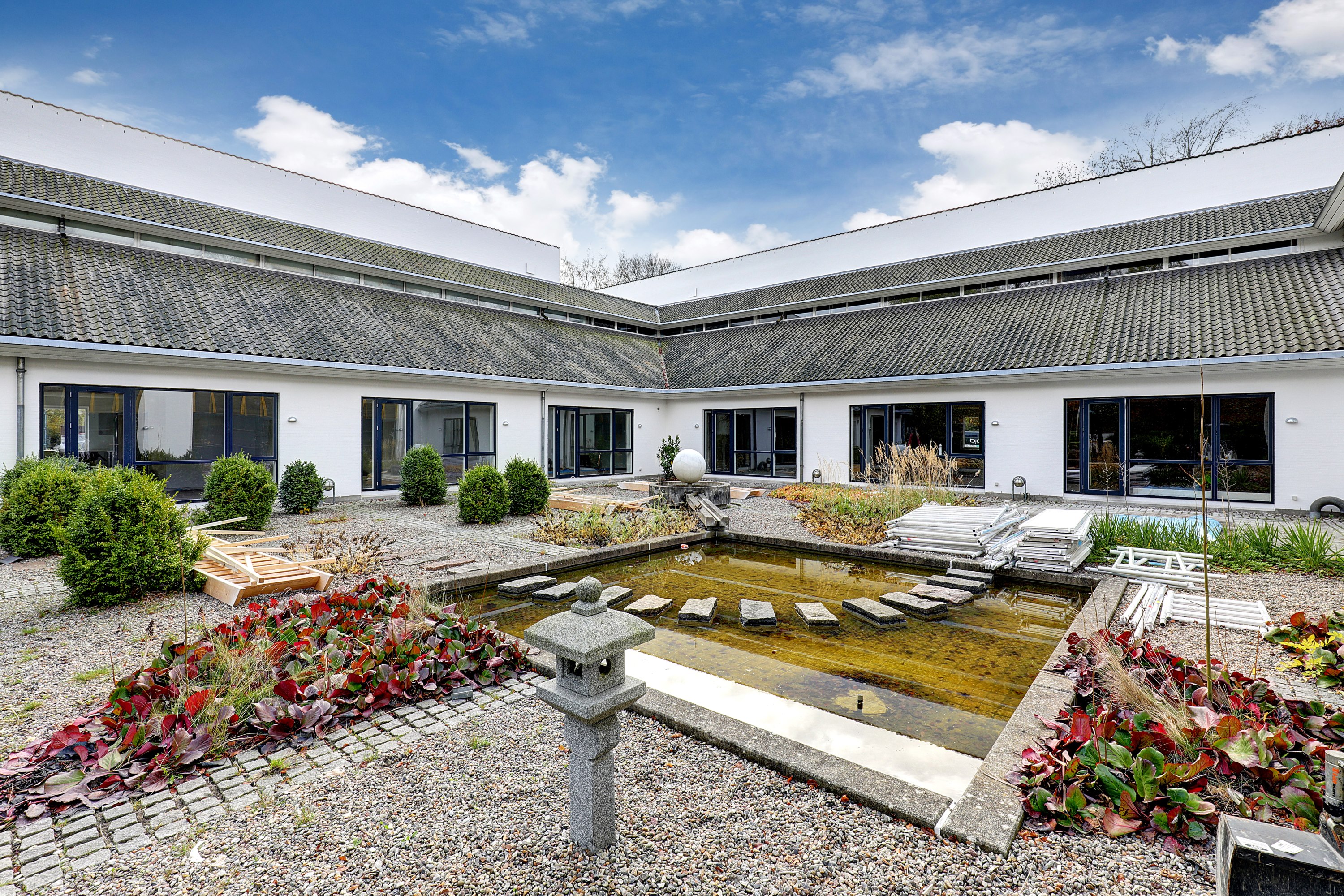 Bygningen er omkranset af et grønt bælte af gamle træer og med respekt for den smukke arkitektur bevaret med det eksisterende tegltag og hvidpudsede facader.