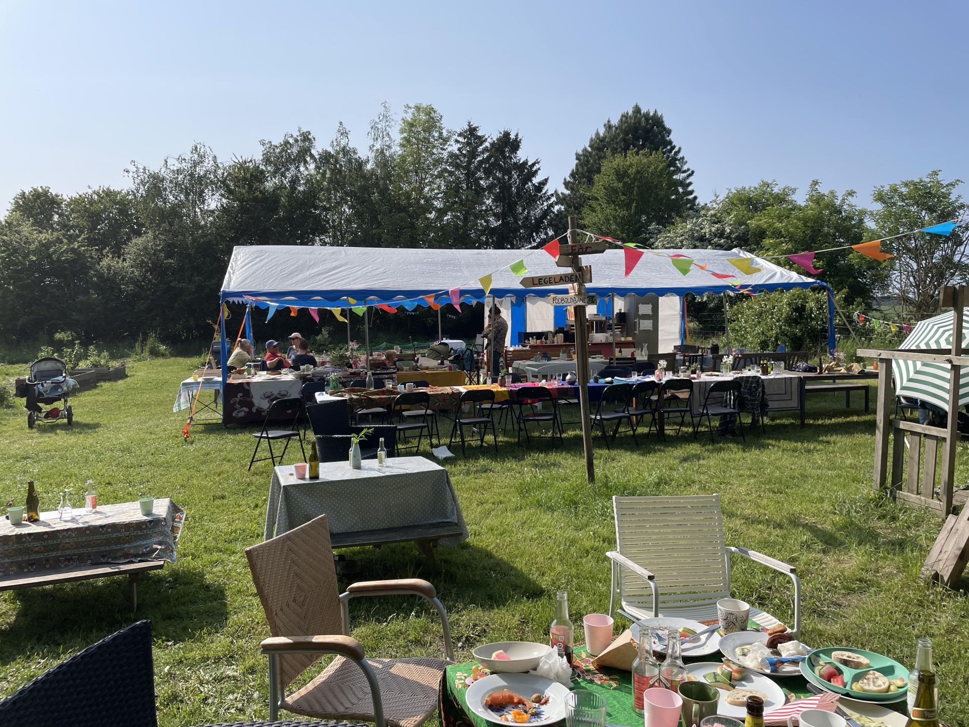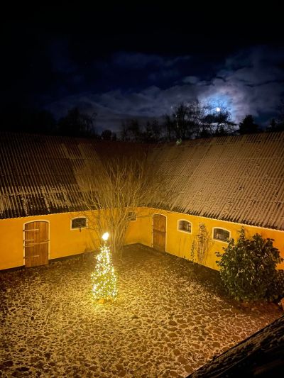Lokalområdet: Gården ligger 3 km fra Stenløse (med s-togstation) og 1,5 km fra Slagslunde, der er en idyl lisk landsby med skole (0.-6. klasse) og daginstitution. Der er et stærkt lokalt sammenhold og der afholdes bl.a. en årlig musikfestival, fredagsbarer og flere forskellige fritidsaktivite ter som kor, keramik, forskellige sportsgrene og yoga. Vores nærmeste naboer er hhv. et andet gård-kollektiv med 5 familier og et flergenerations-bofællesskab med 3 familier. Vi har et godt internt fællesskab, hvor vi holder bl.a. faste lavn, Skt. Hans og høst/forårsfest sammen. Gården ligger i et meget naturskønt område med istidslandskab og kort afstand til Buresø, hvor man kan bade og komme til flere forskellige skove.