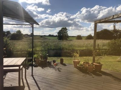 Om boligen: Boligen er kendt som ”Længen” og ligger for sig selv med en fantastisk udsigt over marker og skov. Den består af et køkken-stue-alrum på ca 30 kvm, stor entré og stort badeværelse, samt et stort og et mindre værelse på førstesalen, der har skrå lofter og fritstående bjælker.
