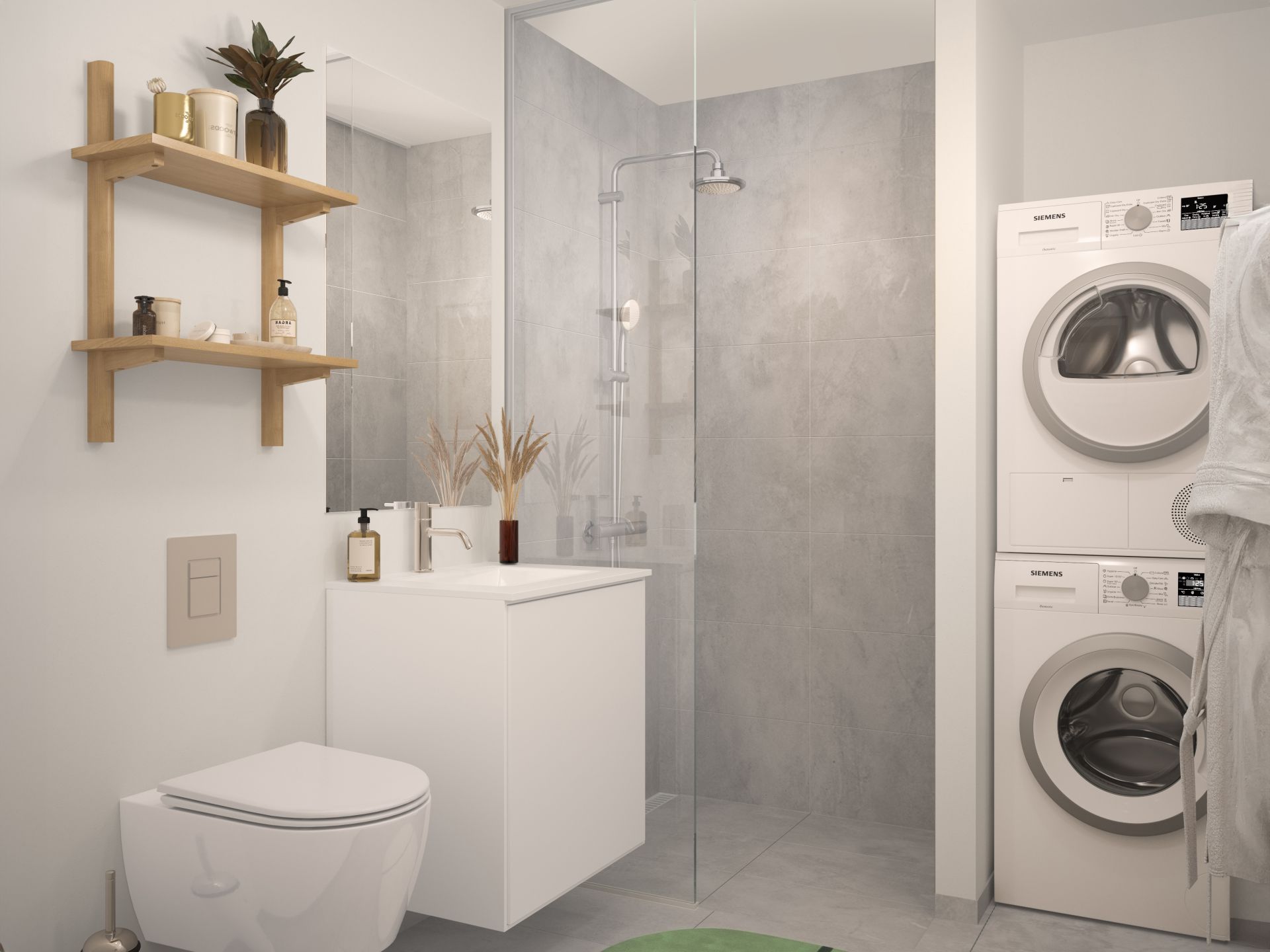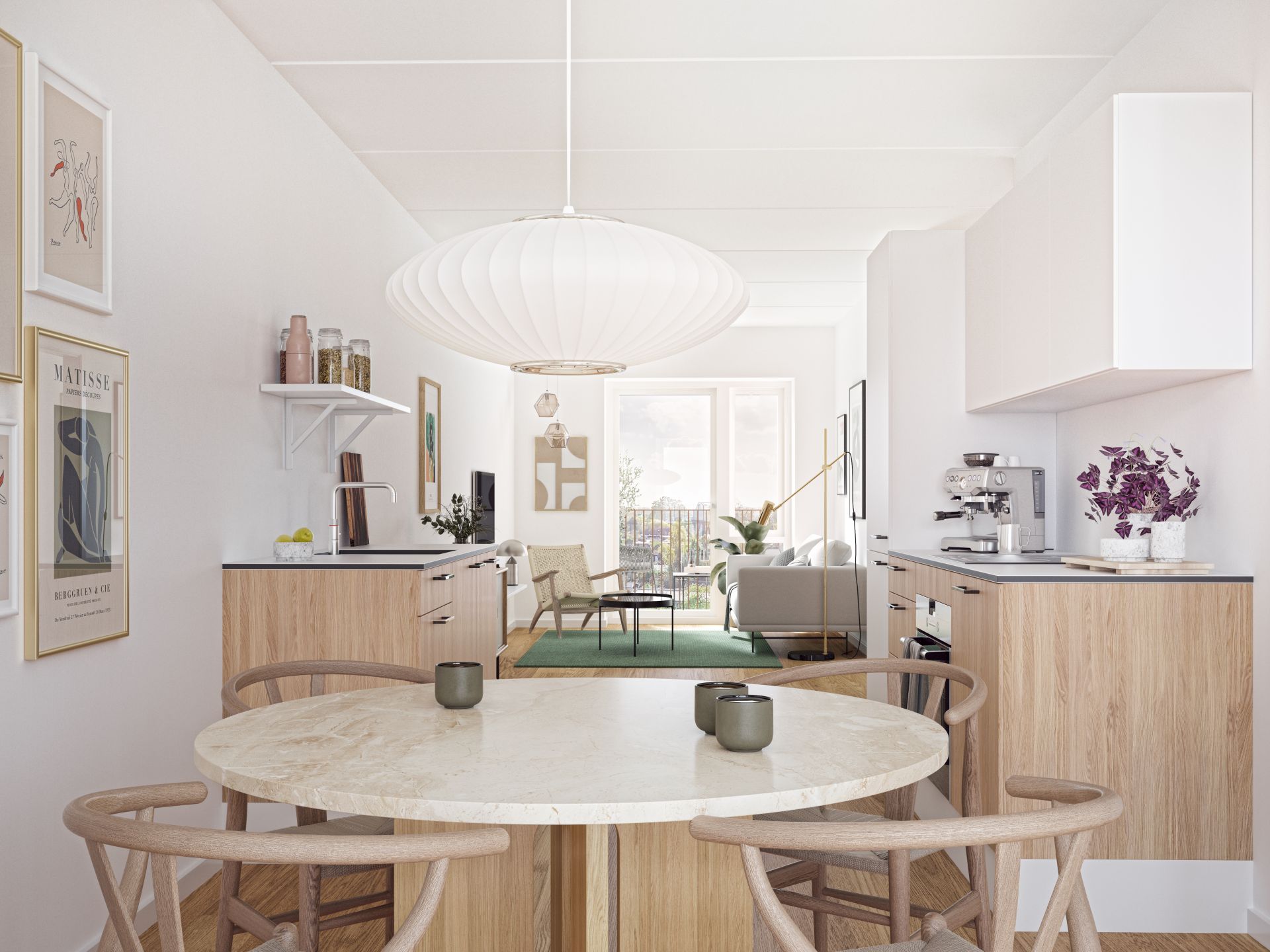 Lejlighederne er mellem 59 og 94 kvadratmeter fordelt på 2 og 3 værelser. Alle lejligheder er indrettet med en entré, et stort sammenhængende køkken/alrum og stue med udgang til egen terrasse eller altan og et dejligt badeværelse med brus og vaskesøjle. Lejligheden har naturligvis alt i hårde hvidevarer og et moderne ventilationssystem med genvinding sikrer et optimalt indeklima året rundt.