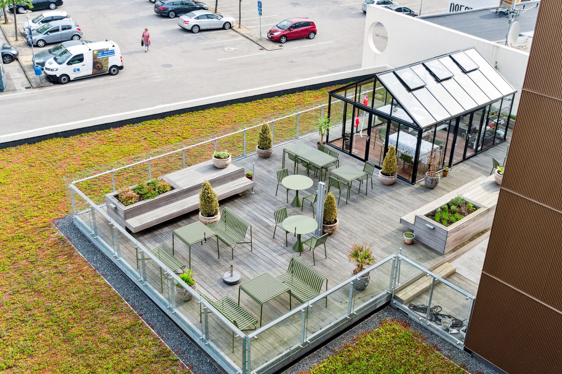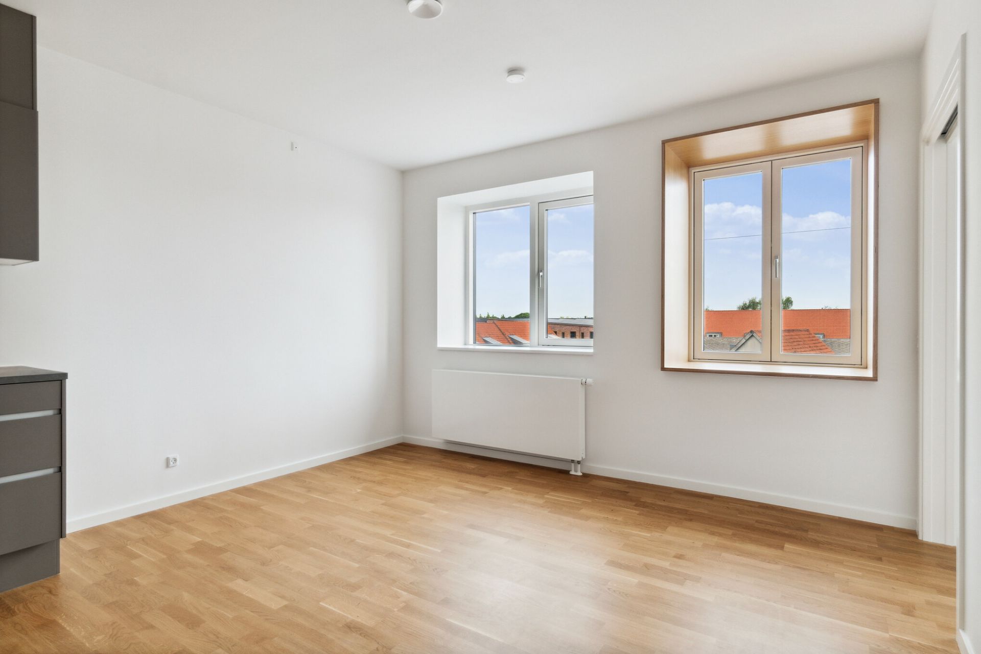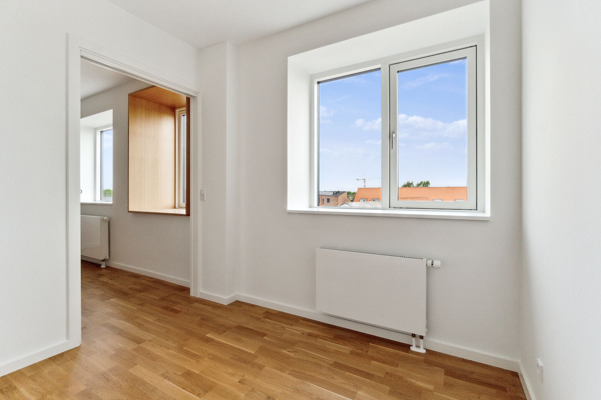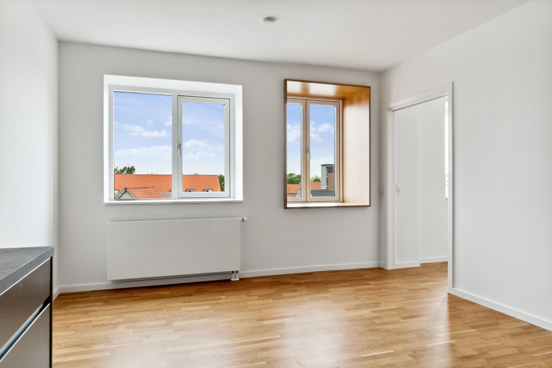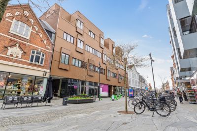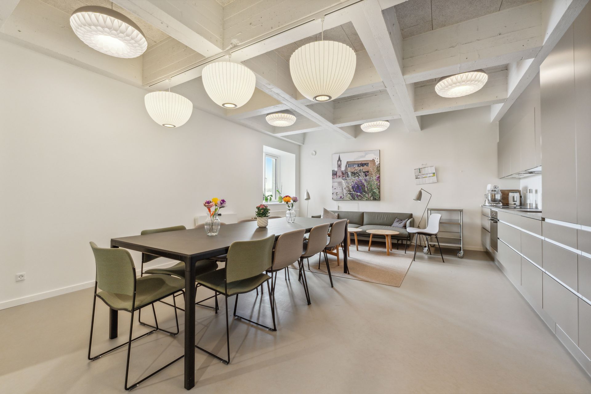 Lige pt. har vi 1 lejlighed til leje i en ejendom med 20 lejligheder, delelejlighed til dine gæster, fælleskøkkener på alle etager, kæmpe terrasse med stort orangeri, gildesal der også er motionsrum og bibliotek, vaskekælder, værksted og 2 cykelrum.