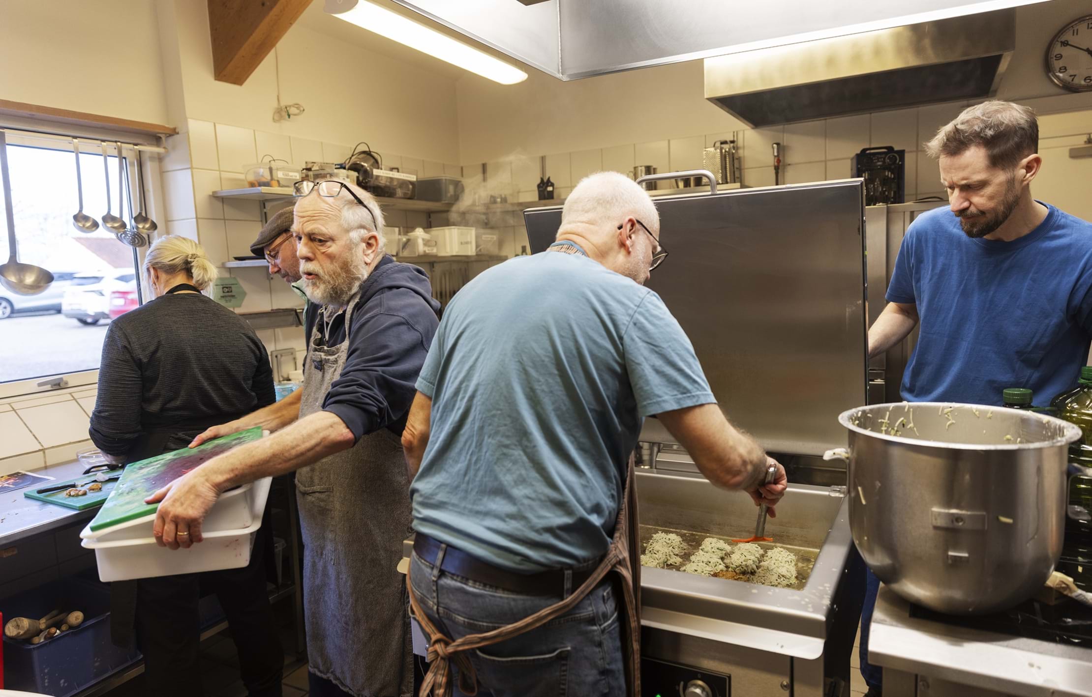 Andelshaverne skiftes til at lave mad i det store industrikøkken.