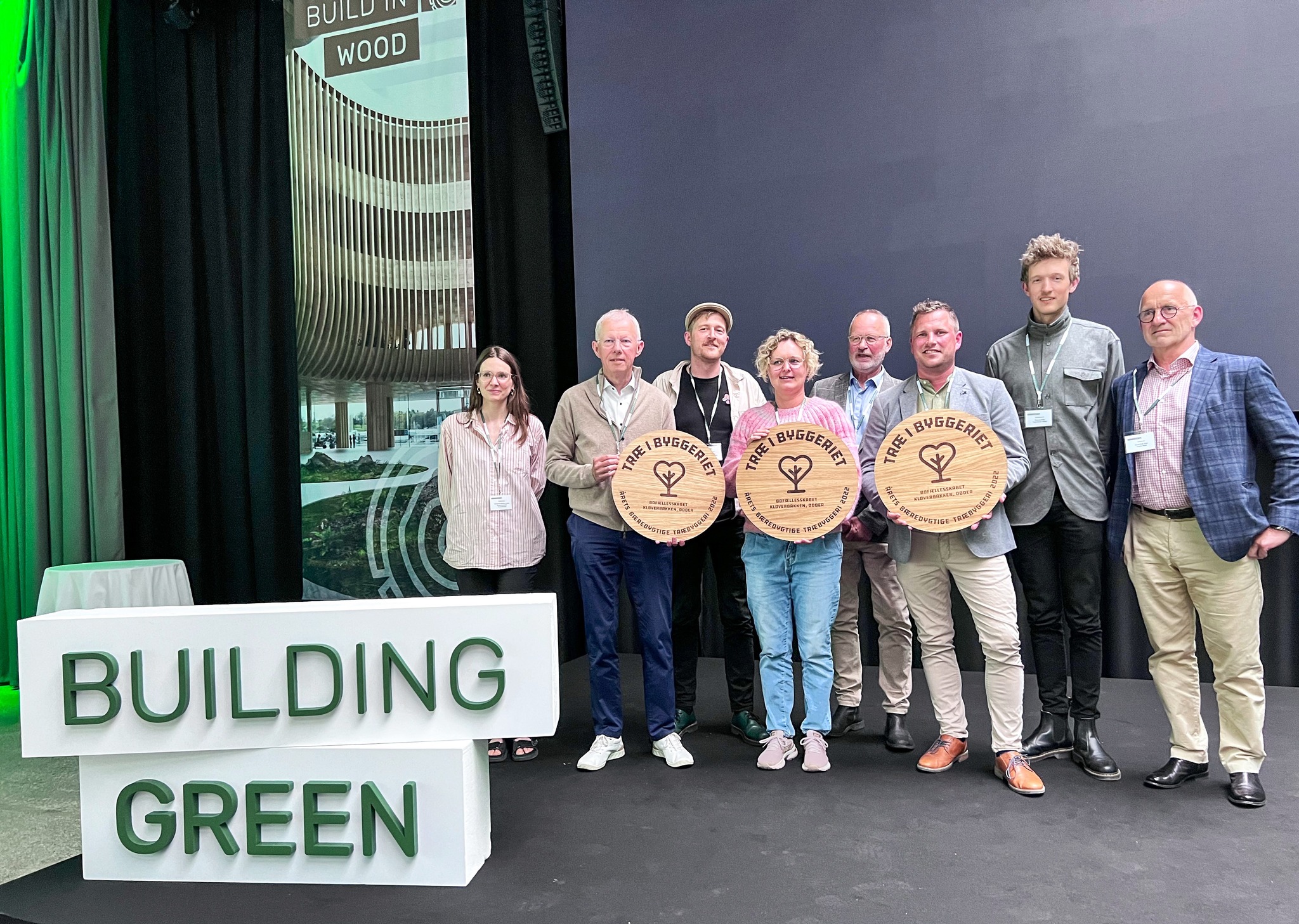 Rasmus & Knud-Erik er nået til København. Næstformand Martin Petersen fra Træ I Byggeriet er gået på scenen, og øjeblikket er kommet, hvor vinderen af Årets Bæredygtige Træbyggeri 2022 skal kåres. Der bliver stille i salen. Men kun ganske kort, for et øjeblik senere rejser det lille hold fra Thybo, Tegnestuen Arken og beboerne fra Kløverbakken sig i jubel.